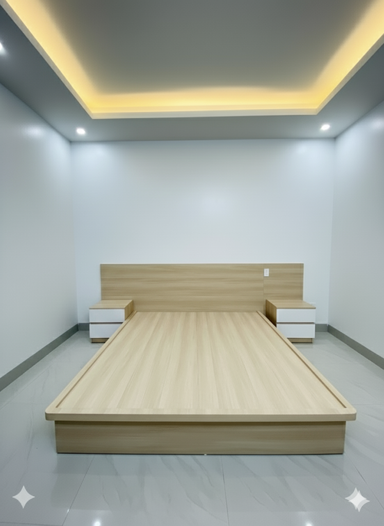 Giường thấp (platform bed): Giường được thiết kế dạng bục thấp, màu vân gỗ nhạt kết hợp trắng, tạo cảm giác vững chãi và hiện đại.