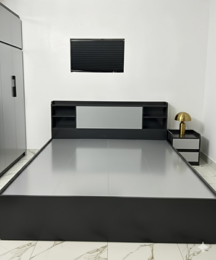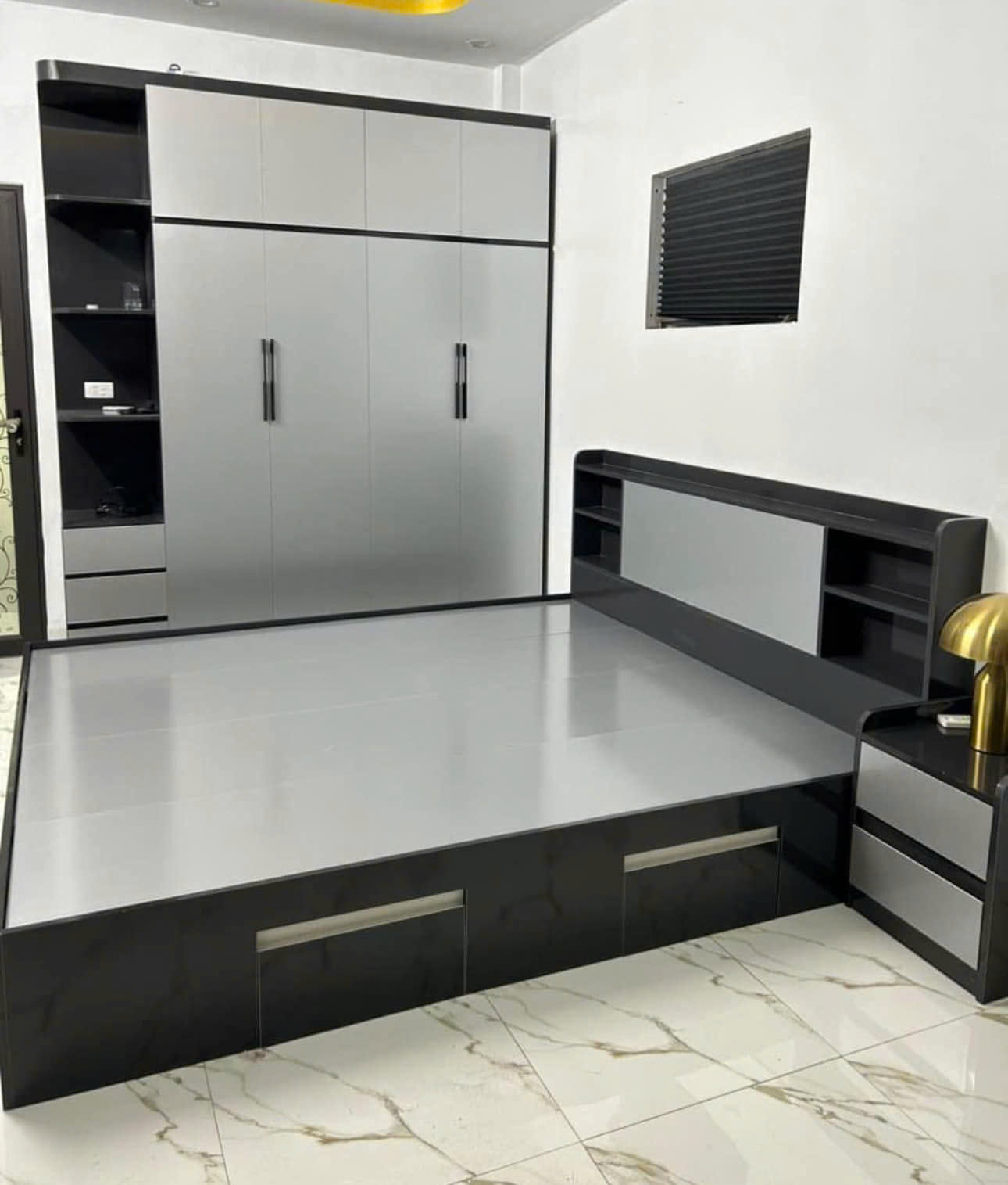Nếu bạn đang tìm kiếm bộ nội thất phòng ngủ vừa đẹp, sang trọng, lại bền bỉ theo thời gian, thì nhựa Vinco cao cấp chính là lựa chọn lý tưởng. Bộ sản phẩm trong hình gồm giường ngủ, tủ quần áo và tab đầu giường, được thiết kế theo phong cách hiện đại, tone xám – đen mạnh mẽ và tinh tế, phù hợp với các căn hộ, nhà phố hoặc phòng trọ cao cấp.