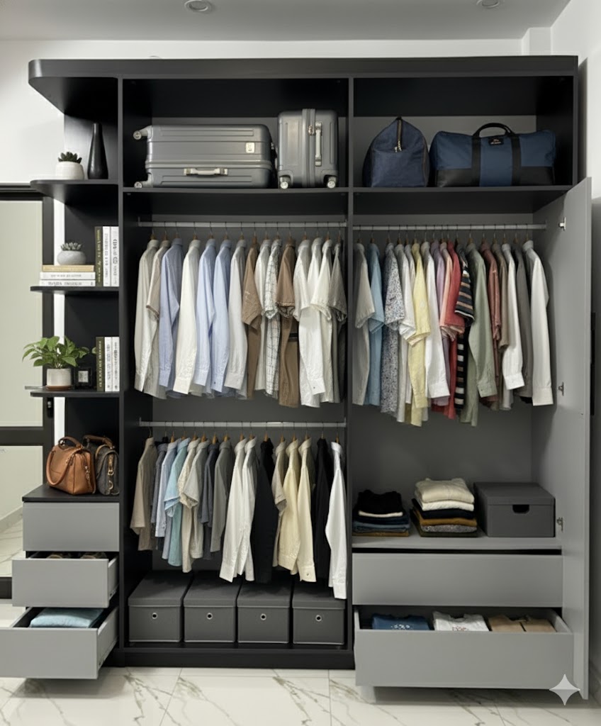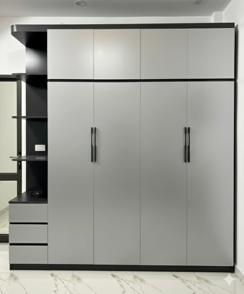 Tủ quần áo 4 cánh kết hợp kệ mở bên hông mang lại sự tiện nghi và hiện đại.