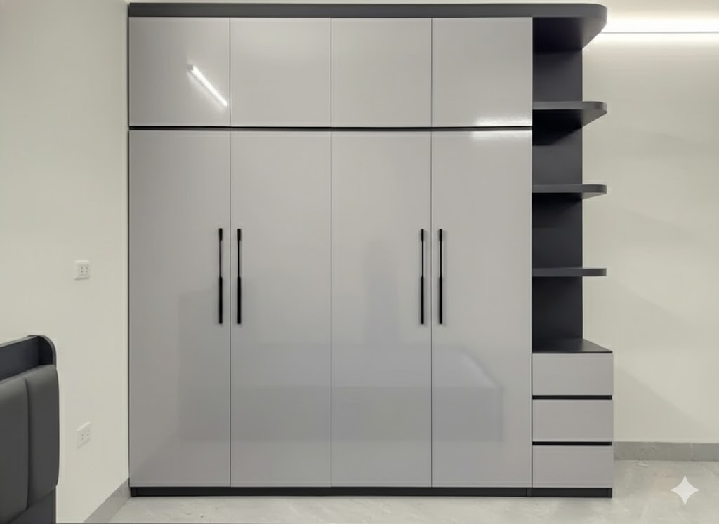 Mặt Tủ/Cánh Tủ: Sử dụng màu Xám Nhạt/Trắng (Light Gray/Off-White) với bề mặt bóng (Glossy) hoặc bán bóng (Semi-Glossy), có thể là vật liệu Acrylic, Laminate bóng, hoặc Melamine bóng. Điều này giúp phản chiếu ánh sáng và làm căn phòng trông rộng rãi hơn.