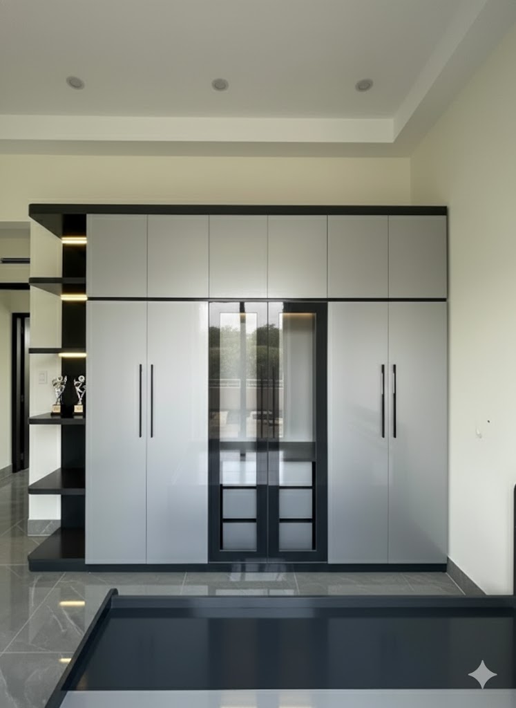 Thiết Kế: Tủ lớn, kéo dài sát trần, có vẻ được thiết kế riêng (custom-built) để tối ưu không gian.