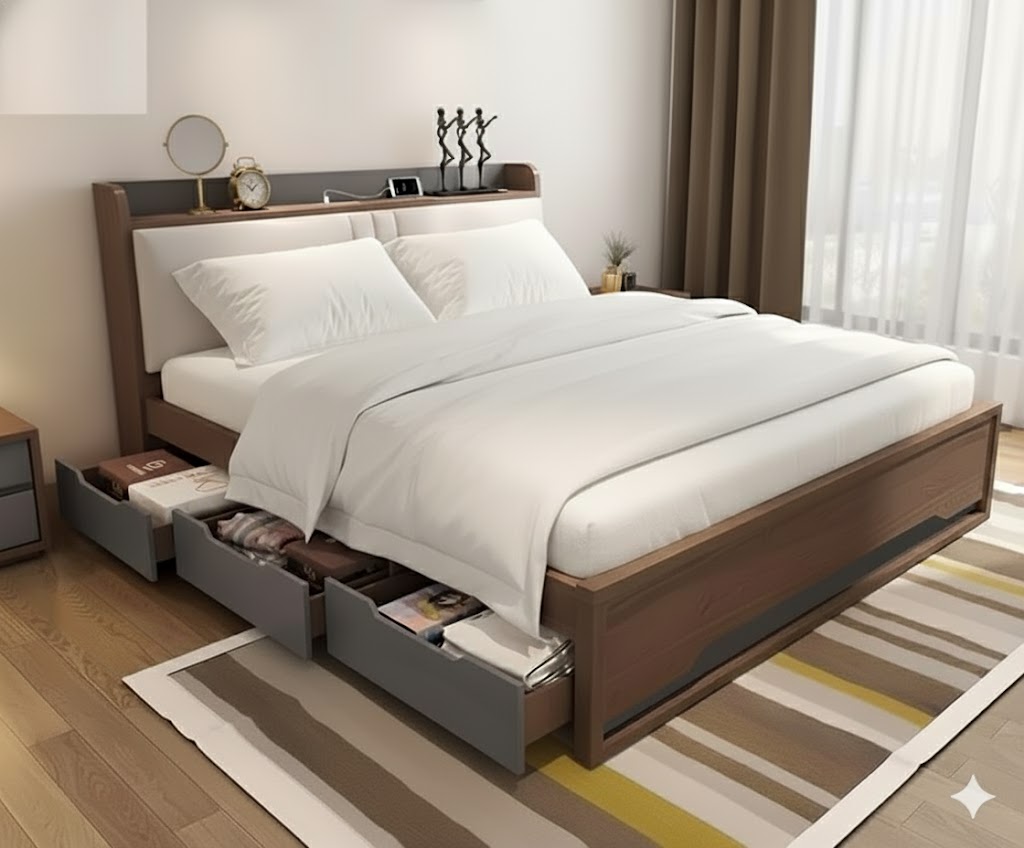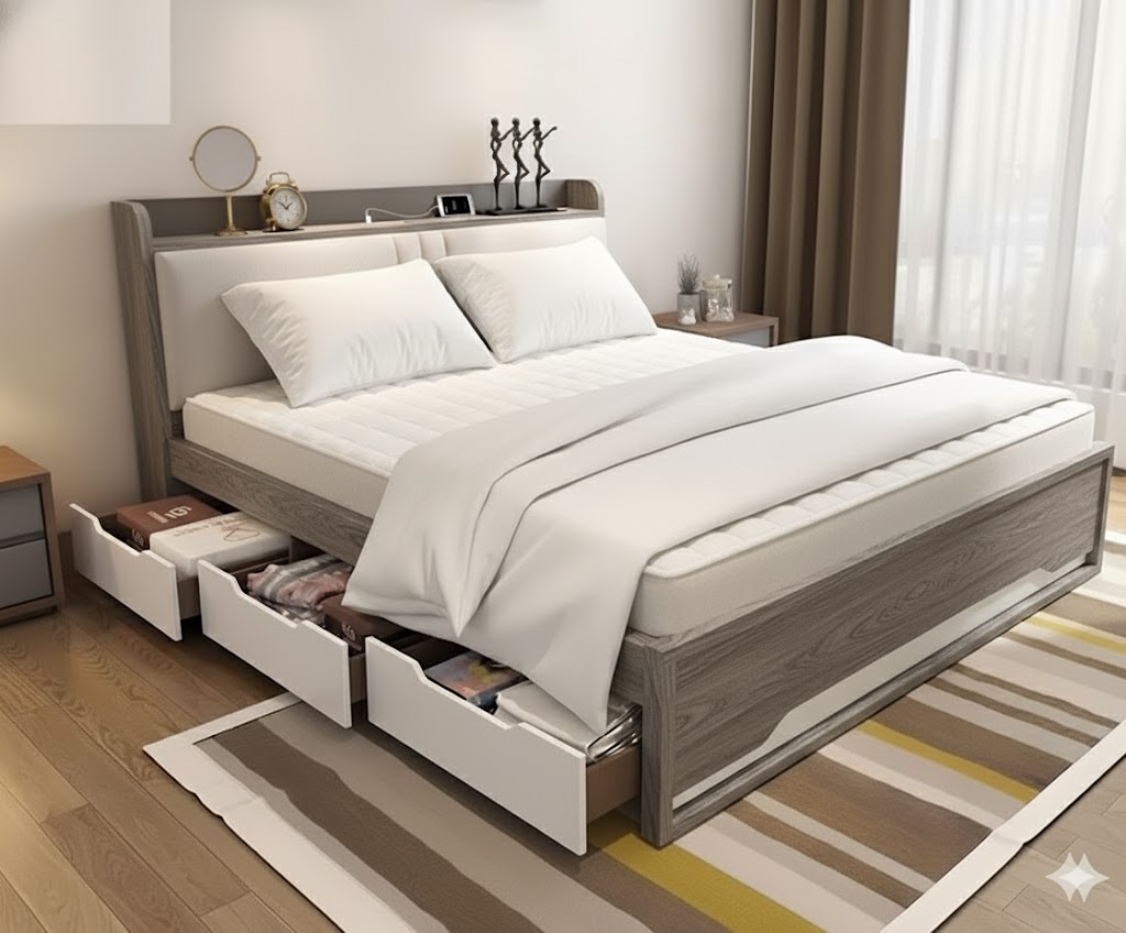 Tối ưu hóa không gian lưu trữ: Với ba ngăn kéo dưới giường, bạn có thể dễ dàng lưu trữ chăn, gối, quần áo hoặc các vật dụng cá nhân khác mà không chiếm dụng diện tích phòng. Điều này đặc biệt hữu ích cho những phòng ngủ có diện tích hạn chế.