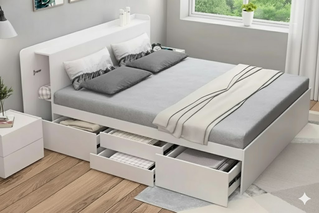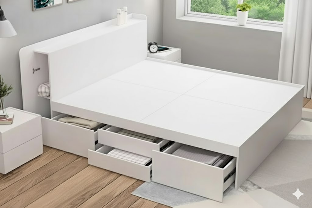 - Giường ngủ gỗ MDF thông minh có 4 ngăn kéo 3 cánh lật cao 40cm