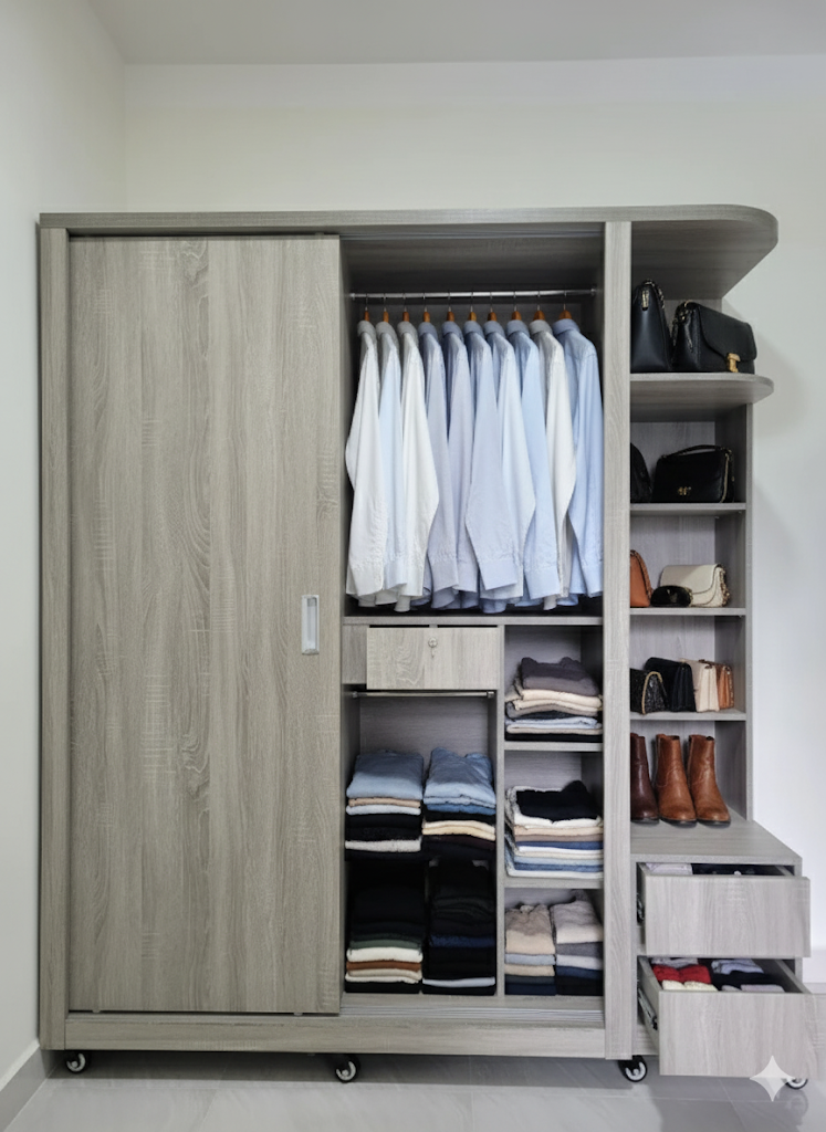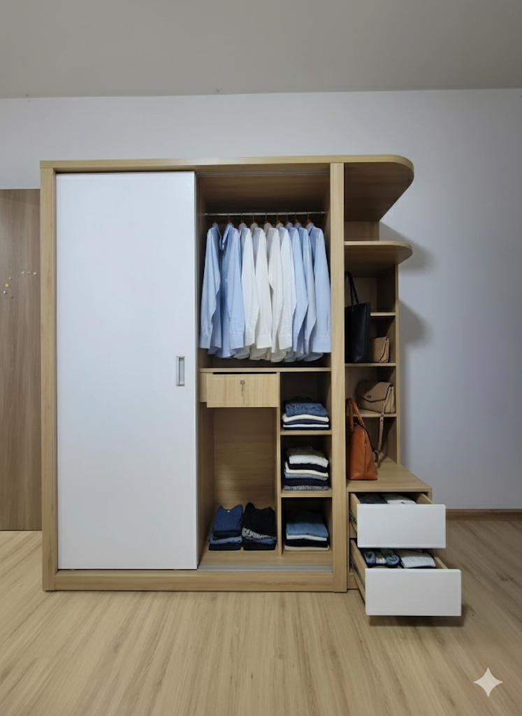 Điểm mạnh của mẫu tủ là có kệ trang trí ngoài, vừa để sách, mỹ phẩm, túi xách vừa tăng tính thẩm mỹ cho không gian. Bên trong tủ chia bố cục khoa học: 1 khoang treo quần áo dài, 1 khoang để gấp, thêm ngăn trên để đồ ít dùng. Phù hợp nhu cầu từ sinh viên, gia đình, căn hộ cho thuê đến các dự án nội thất trọn gói.